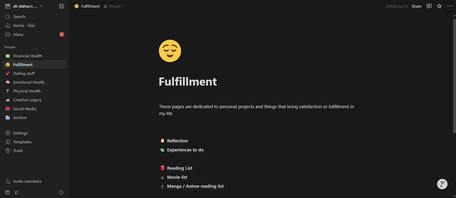 In Notion, I pretty much have everything: ideas for creative ventures, work notes, job interviews, personal finances, and reflections upon reflections.