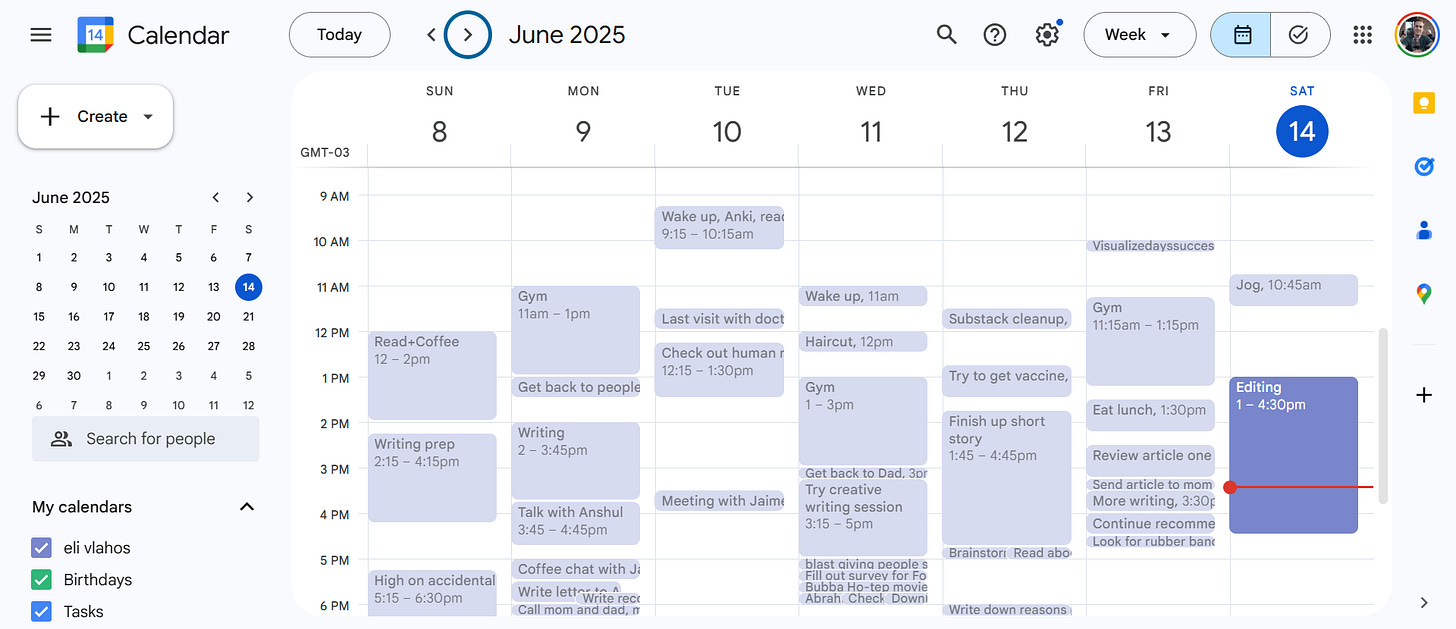 It’s also incredibly useful for structuring your day. Eventually you get an idea of what your bandwidth for a given period of time is, and you can organize your week + goals accordingly.